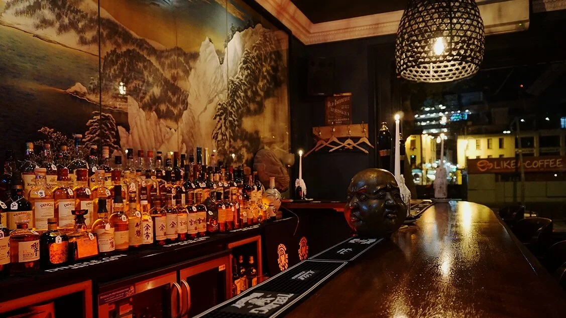 The design vision behind the Whisky Bar was inspired by authentic Japanese cocktail bars, sultry and dimly lit spaces with a sophisticated air and top-notch cocktail selections. Graham Ryan, general manager of Yamamori and visionary behind The Whisky Bar, wanted to reflect this aesthetic while also referencing the traditional production process and taste of Japanese whisky: the rich smoky notes of aged wooden barrels, and the dark tones of singed barrel-top branding. Drawing on traditional whisky label designs and advertisements, the new signage and interior elements use old dark barrels with the Whisky Bar logo.