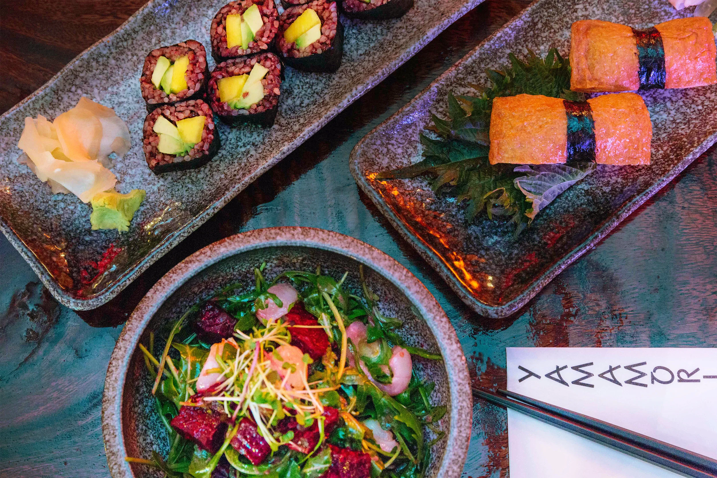 Clockwise from top left: Avocado and Mango Nori roll, Inari Nigiri, and Beetroot and Lychee Salad