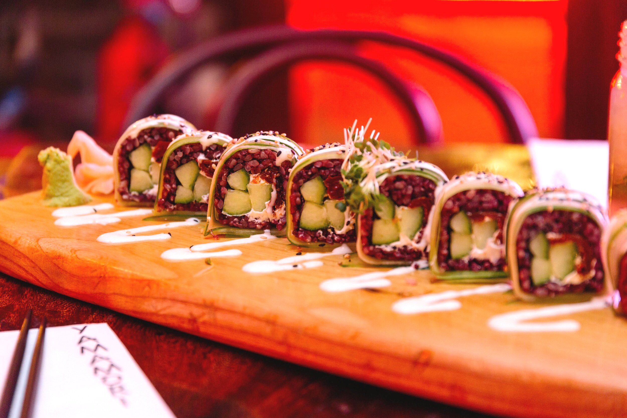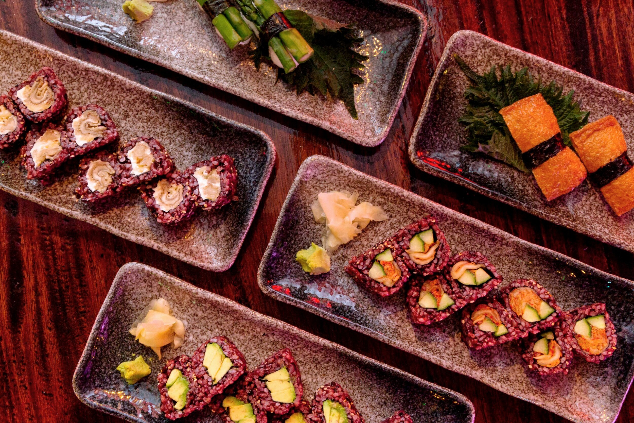 Clockwise from top left: Asparagus nigiri with white rice; Inari nigiri; Cucumber and Kimchi norimaki, Avocado norimaki, and Oyster Mushroom and Cream Cheese norimaki [vegan option available without cream cheese], all with black rice option