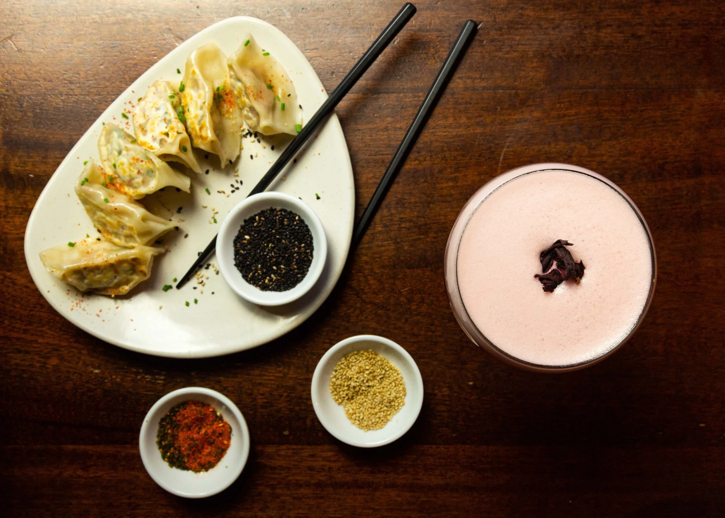 Yasai (vegetable) Gyoza pictured with a house cocktail. Regularly served with a sweet and tangy gyoza sauce