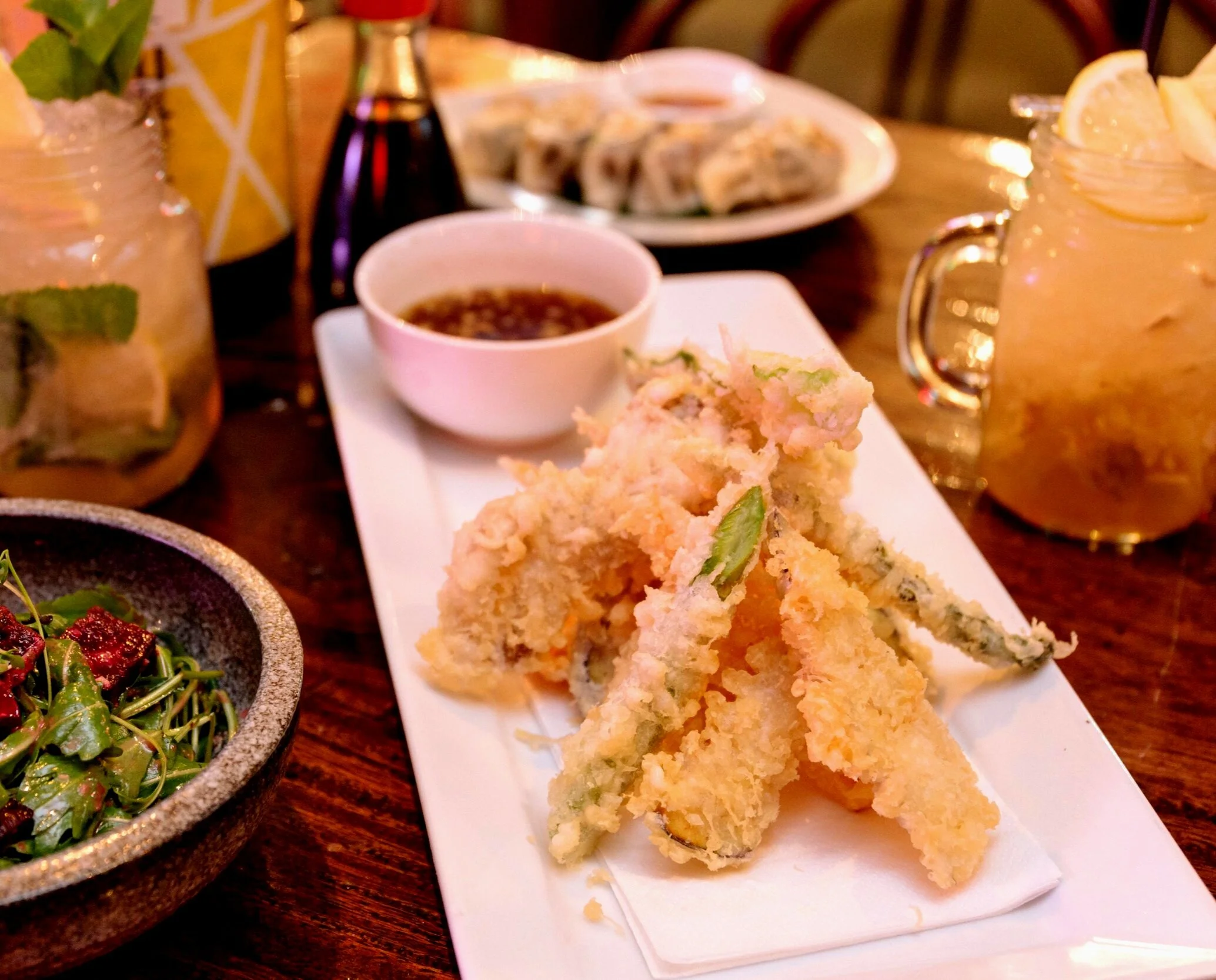 Yasai (Vegetable) Tempura pictured with Beetroot and Lychee Salad, Vegetable Gyoza and house Lemonades